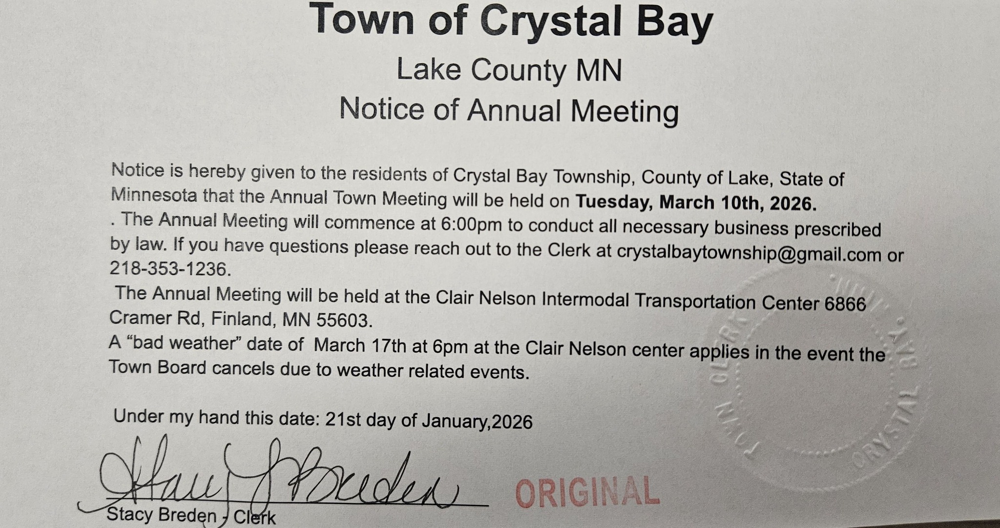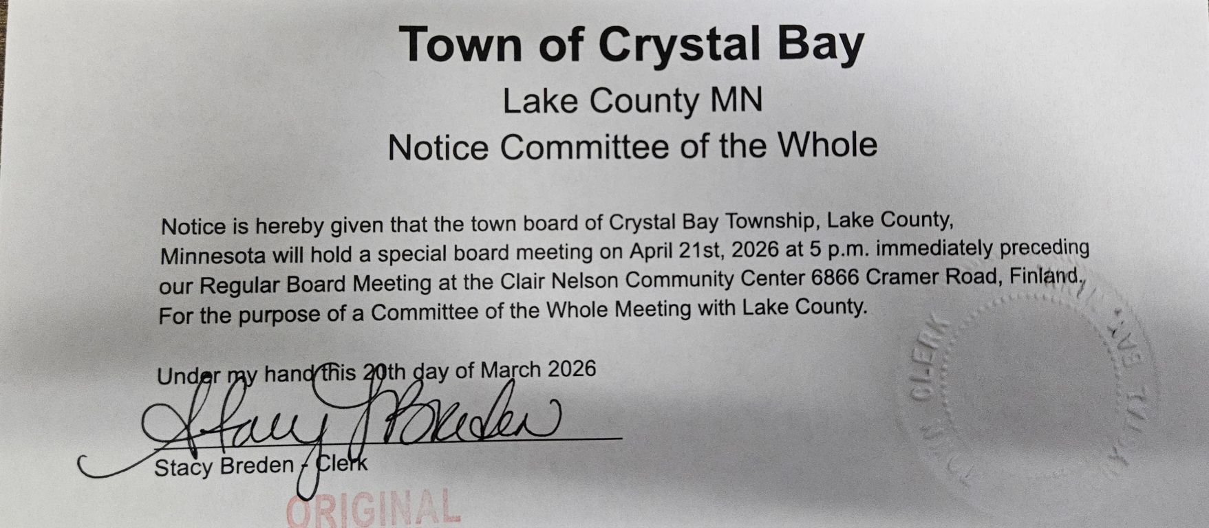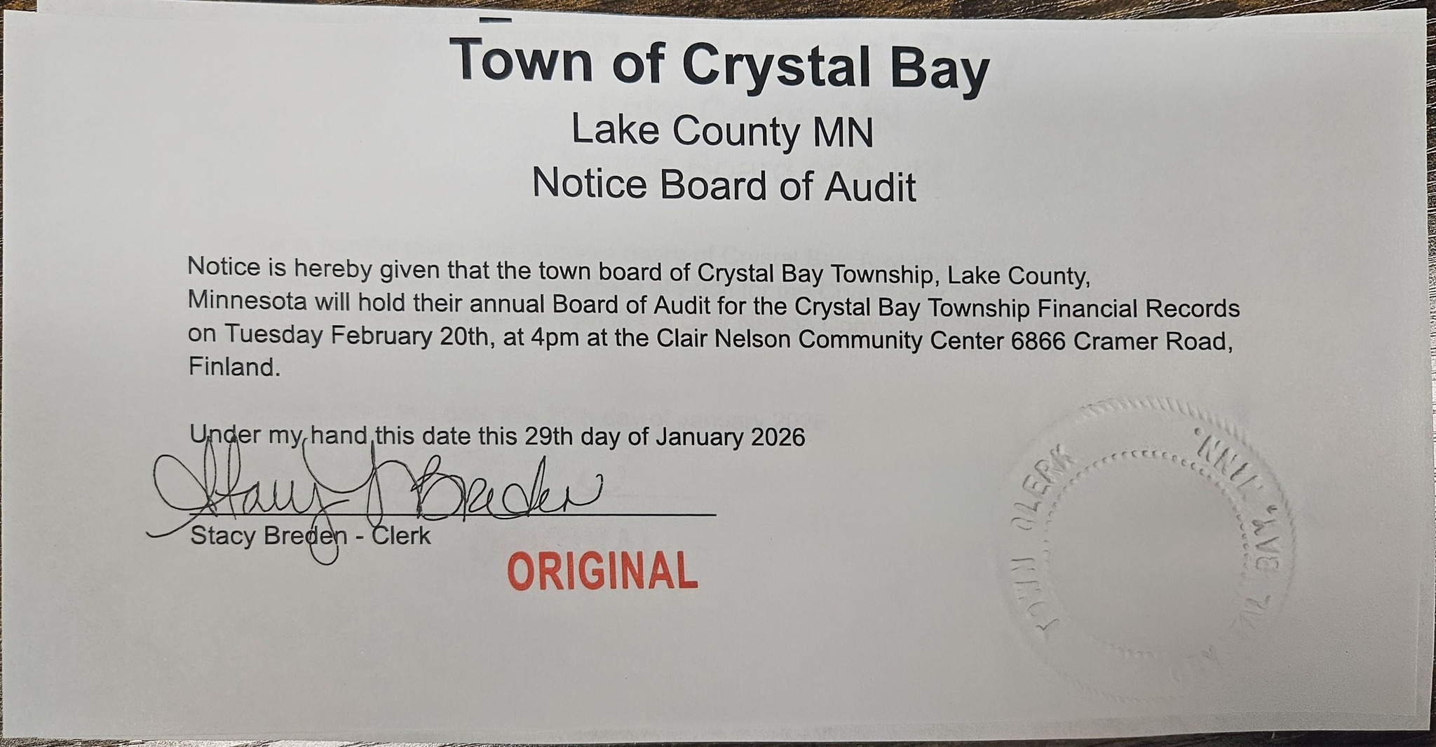 NOTICES Please Check here for Crystal Bay Township Notices: Board of Appeals & Equitization May 2026Download Committee of the Whole April 2026Download Annual Meeting March 2026 Download Board of Audit 2026Download Yearly Schedule 2026Download Board of Appeals & Equilization May of 2025Download Committee of the Whole April of 2025Download Annual Meeting March of 2025Download 2025’s Yearly Meeting Schedule Download Share this: Share on X (Opens in new window) X Share on Facebook (Opens in new window) Facebook Like Loading...